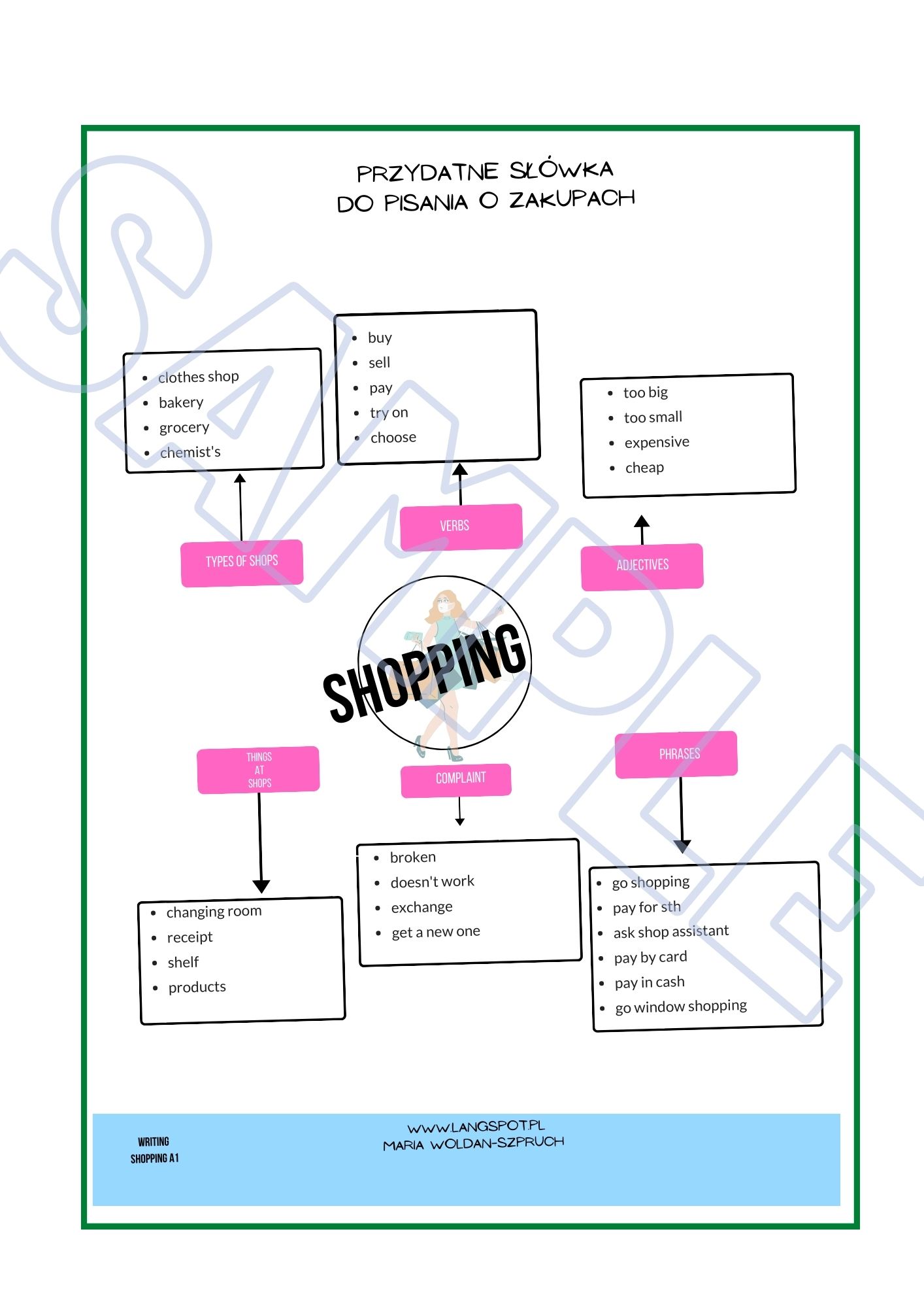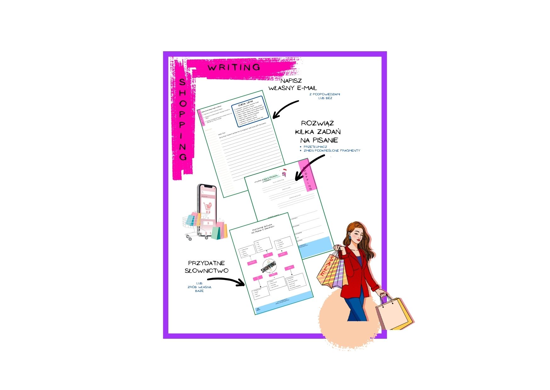 Zestaw “Writing Shopping A1” PDF zawiera: