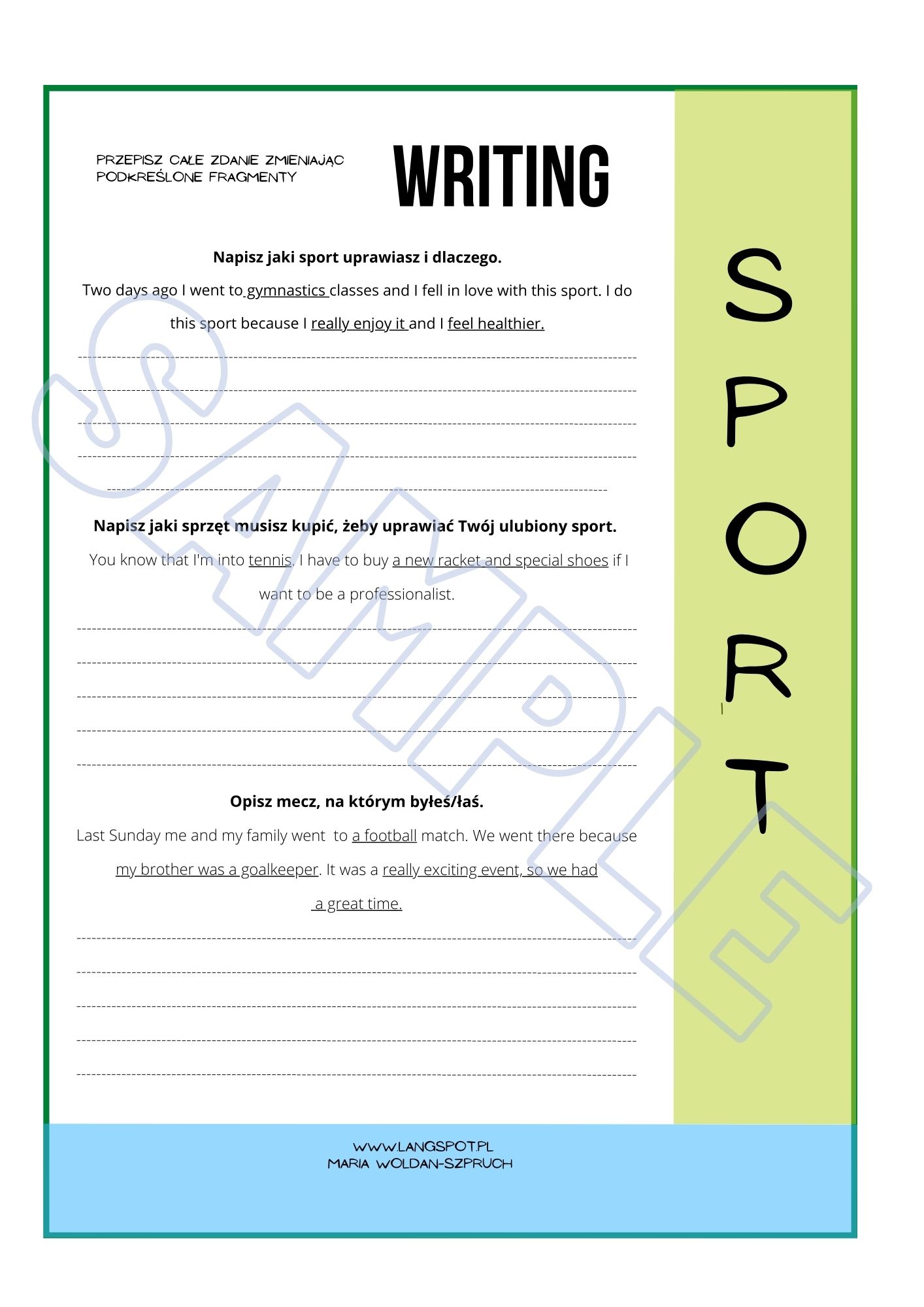 Zestaw “Writing Sport A1/A2” PDF zawiera: